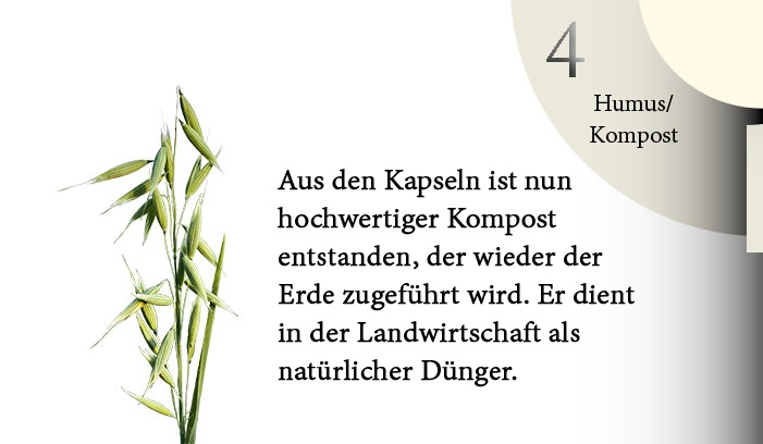 Unsere Kaffeekapseln bestehen aus einem Biokunststoff. Die Bestandteile des Biokunststoffes stammen überwiegend aus nachwachsenden Rohstoffen. Die Kapseln bestehen grösstenteils aus Polymilchsäure, Zellulose (Pflanzenfasern) und Calziumcarbonat (Kalk). Polymilchsäure wird aus nachwachsenden Rohstoffen auf Zuckerbasis gewonnen, z.B. aus Zuckerrüben und der Maispflanze.